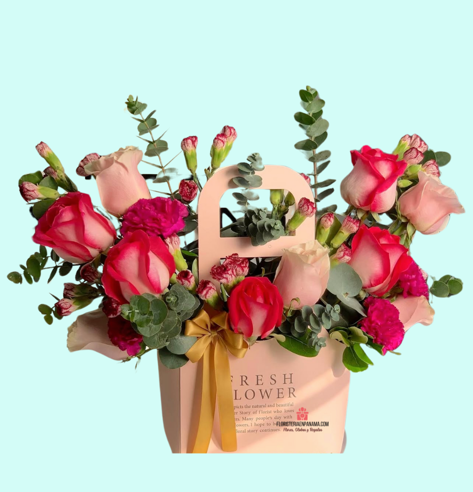 Este delicado arreglo floral combina rosas, mini claveles y eucalipto, diseñado en una elegante bolsa premium con lazo dorado. Es ideal para sorprender en cumpleaños, agradecimientos, aniversarios o simplemente para iluminar el día de alguien especial. Perfecto para regalos express y entregas a domicilio en Panamá.