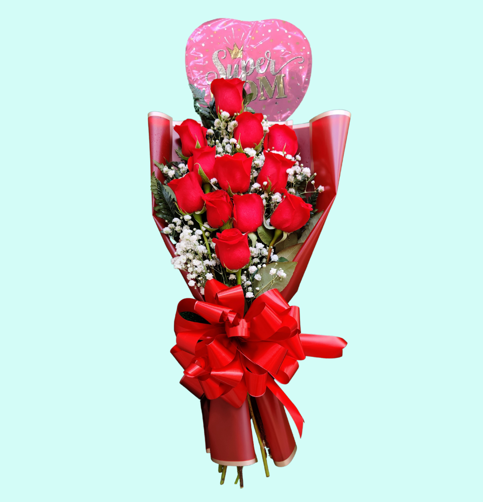 Ramo de 12 rosas rojas con globo, un detalle especial para este día de las madre, no olvides obsequiar y ordena ahora los mejores modelos aquí en tu Floristería en Panamá.