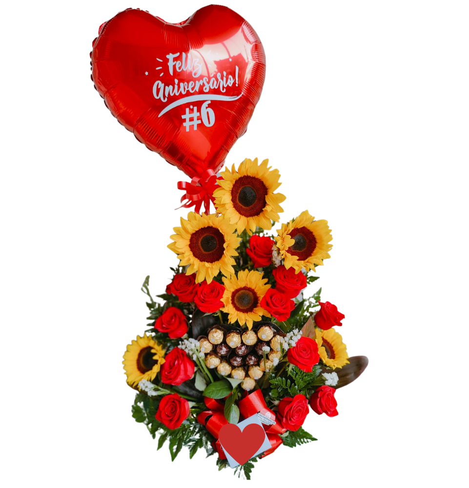 Arreglo variado con 12 Rosas, 6 Girasol toques de otras flores complementarias 16 chococates ferrero y Globo según ocasión. No olvides obsequiar y ordena ahora los mejores modelos aquí en tu Floristería en Panamá.