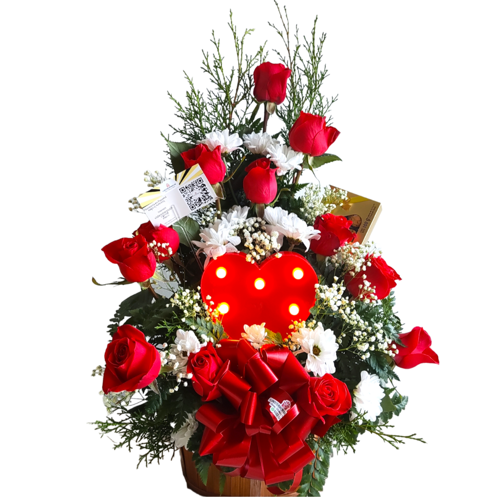 Arreglo de 12 rosas, corazón de Luz y chocolate Ferrero regalo especial, no olvides obsequiar y ordena ahora los mejores modelos aquí en tu Floristería en Panamá.